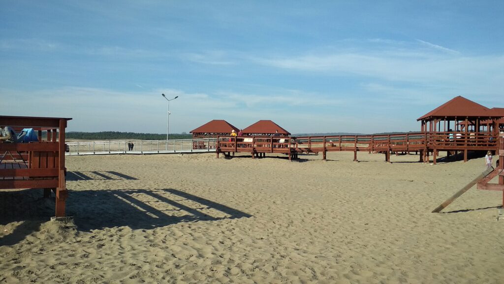Błędów Desert Poland attracts landscape lovers, photographers searching for strong contrast between sand and forest, and visitors interested in geology and the impact of human activity on the environment. Additional attractions include developed viewpoints – including the modern wooden “Rose of the Winds” platform – hiking and cycling paths, and zones used by the army where you can sometimes observe parachute jumps from a safe distance. Families with children appreciate the easy access to viewpoints, benches and shelters, and the chance to play safely on the sand in designated areas.