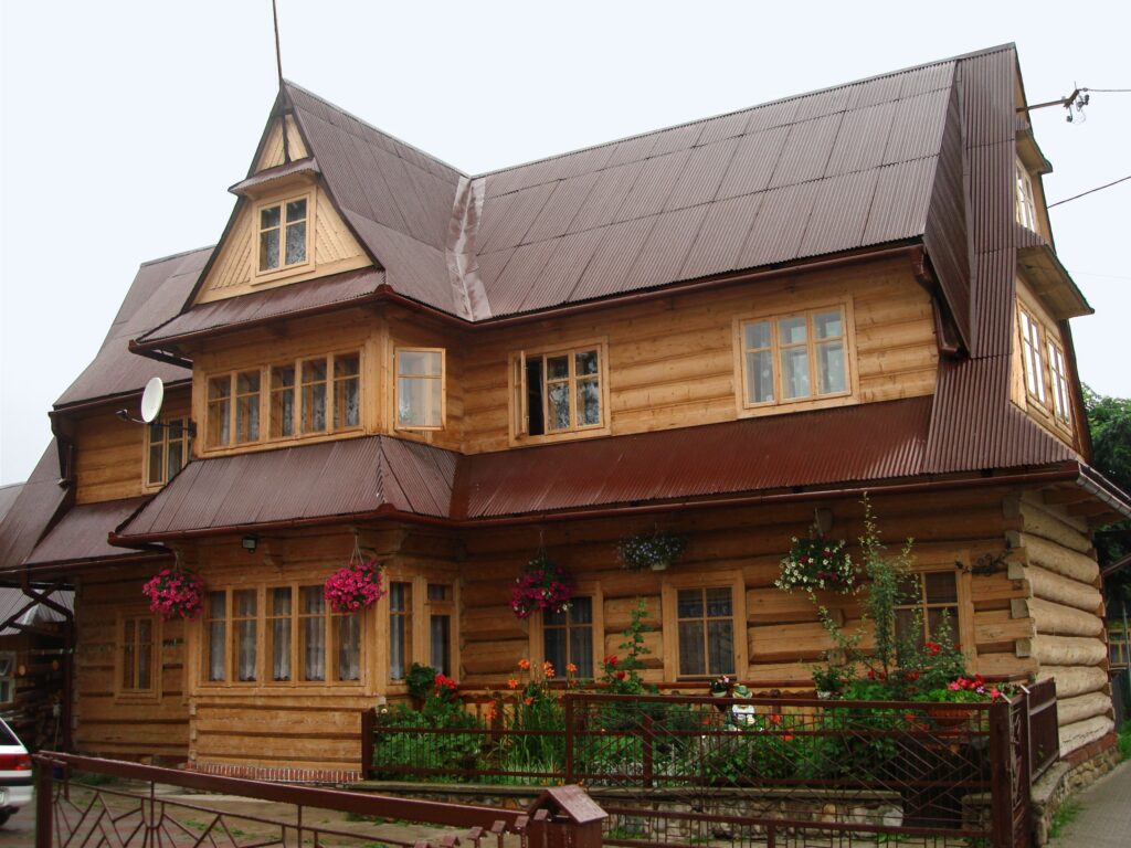 Roof construction follows the traditional half-hip style (połaciowy) with steep 45-50 degree slopes allowing snow to slide off naturally, covered with hand-split wooden shingles (gont) made from larch or spruce wood and fastened using wooden pegs rather than nails. The overhanging eaves (okap) extend 50-80 centimeters beyond exterior walls, protecting log construction from rain damage while creating covered porches along building perimeters. Additionally, gable decorations including carved “słoneczka” (sun symbols) and “pazdury” (claw-like projecting beams) serve both decorative and structural functions, bracing roof trusses against strong mountain winds while displaying carpenter skill and family identity.